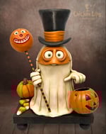 This big boo is hand sculpted from Stone Clay, painted in acrylics and oils, stained and sealed. He stands atop a wood base with risers, at a total height of 12" x 8" wide. He carries a vintage-style pumpkin bucket and a festive Halloween baton. Signed and dated, comes with a Certificate of Authenticity.