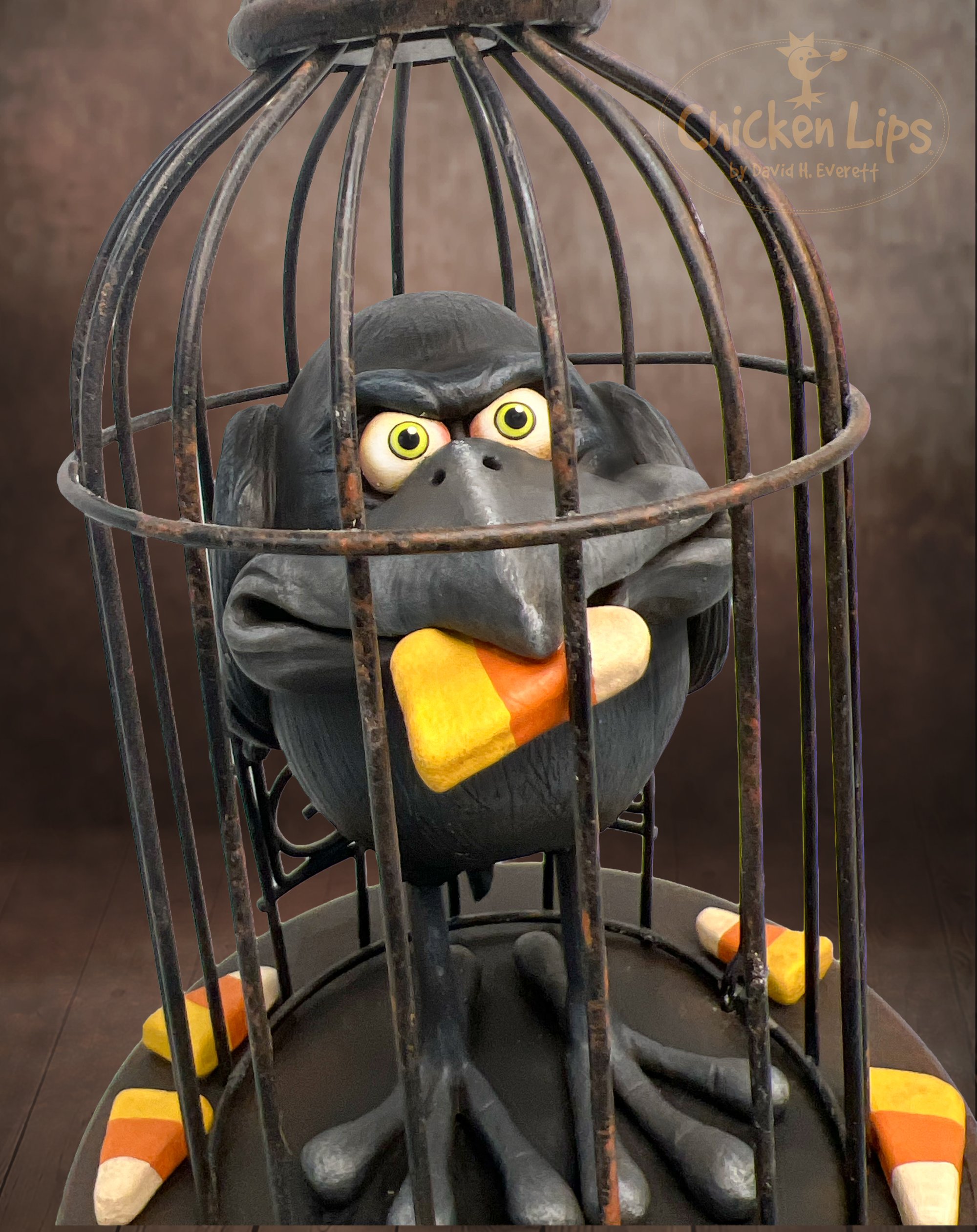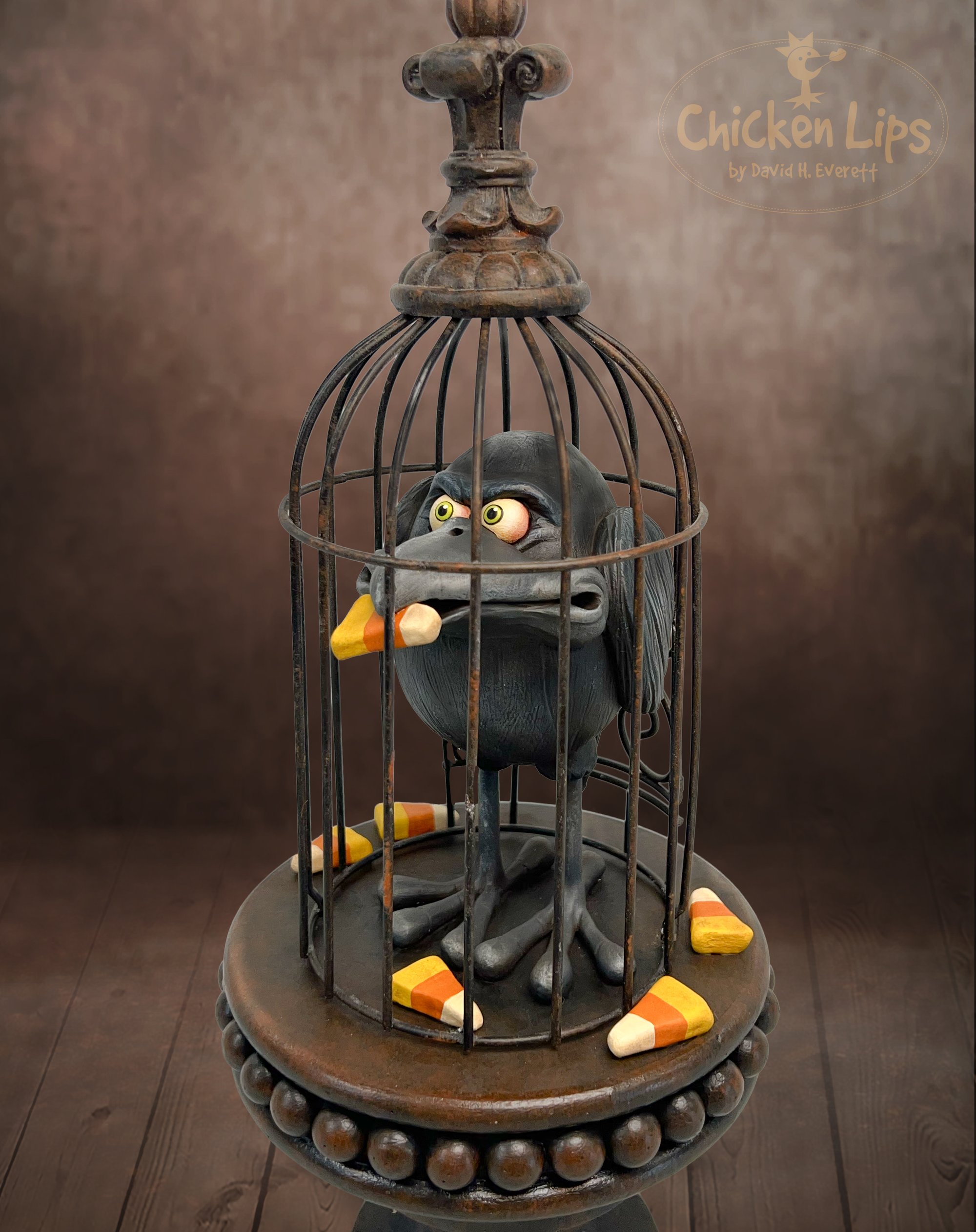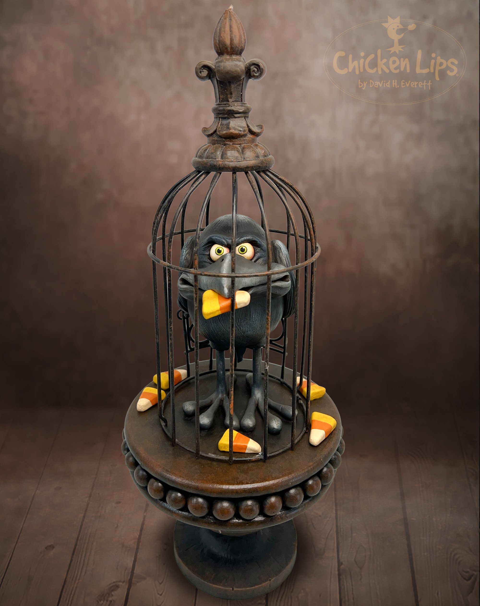He may not have his freedom, but at least he's got plenty of Candy Corns to eat! Hand sculpted from Stone Clay, painted in acrylics and oils, stained and sealed, this mischievous crow resides in a wood/metal cage, 15" tall. Signed and dated, comes with a Certificate of Authenticity.