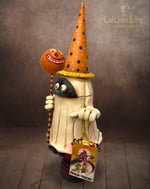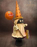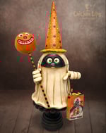 This little boo is hand sculpted from Stone Clay, painted in acrylics and oils, stained and sealed. He stands atop a wood base, at a total height of 13". His handcrafted treat bag is filled with his trick or treat loot (polymer clay). Signed and dated, come with a Certificate of Authenticity.