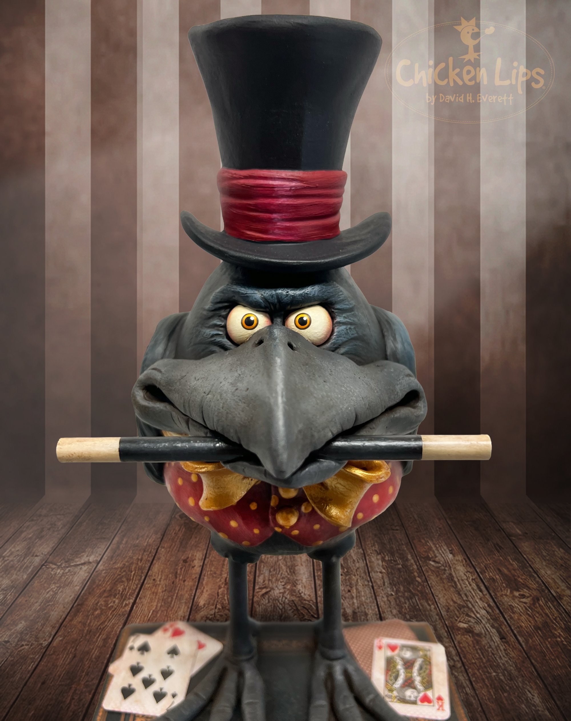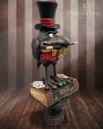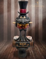 This crow is learning to become a magician! He is ready to astound you with his amazing feats of magic! Hand-sculpted using stone clay, epoxy clay, and wood, then brought to life with layered acrylic and oil paints, stains, and sealers. He stands atop a faux book on a wooden stand. The entire piece is approx. 15" tall. Signed, dated and comes with a signed Certificate of Authenticity.