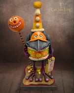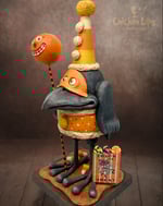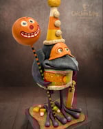 This festive crow is out for a night of Trick or Treating....and it looks like he has scored big! Hand sculpted from Stone Clay, painted in acrylics and oils, stained and sealed, this Halloween crow stands 14" tall atop a wood base. Signed and dated, comes with a Certificate of Authenticity.